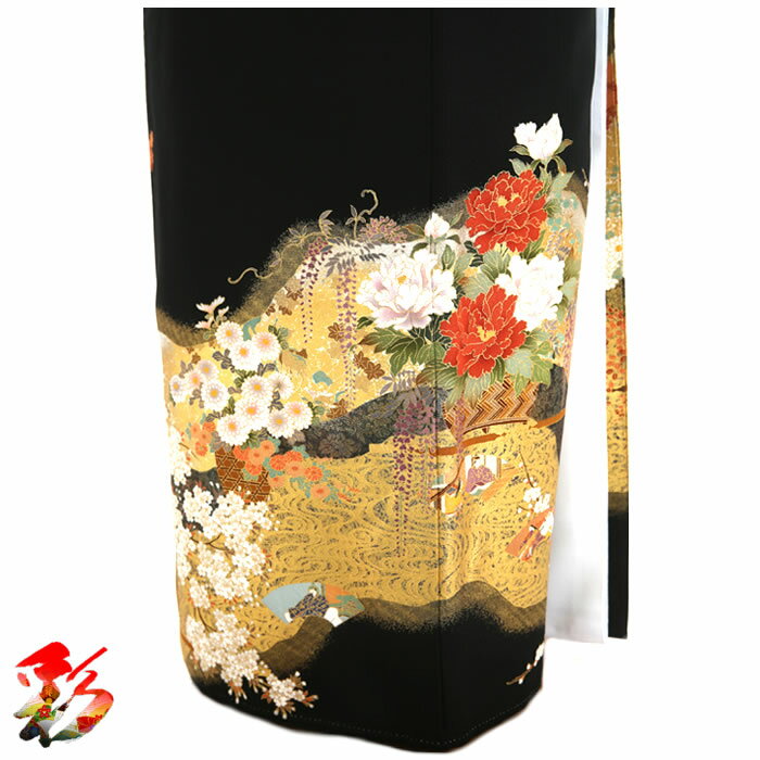 ご成約済み(レンタル不可日) 2024年4月中 ご予約不可 2024年5月中 ご予約不可 2024年10月14日~10月末まで ご予約不可黒留袖フルセットレンタル 留袖レンタル 金に芍薬・菖蒲と藤の花 正絹 ts-02 【黒留袖は既婚女性の慶事の第一礼装です。