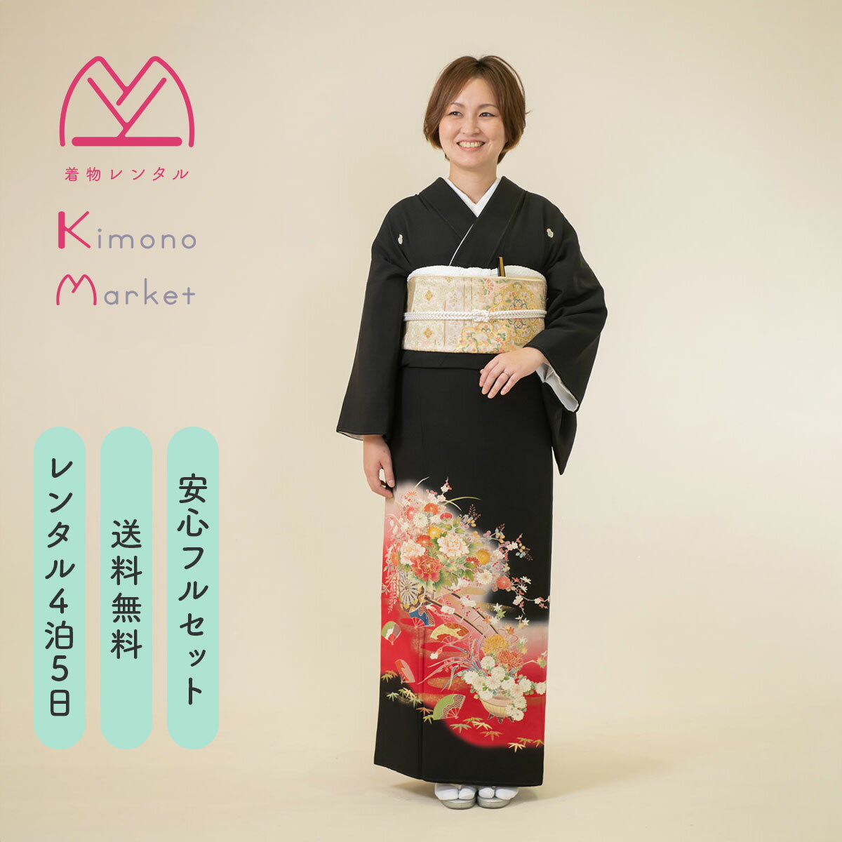 牡丹、菊、藤が咲き誇る花車に大胆な真紅のぼかしを施した華やかでかつ愛らしい印象の黒留袖です。