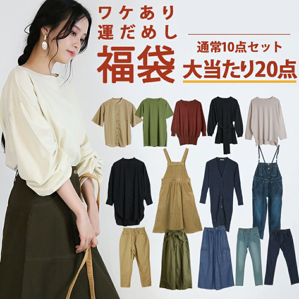 1枚600円!? 訳あり 運だめし福袋 通常10点セット 大当たりの場合は豪華20点セット! 衣類 雑貨 小物 2025 2026 大きいサイズ ハッピーバッグ 格安 トップス ボトムス アウター 半袖 長袖 ニット ワンピース セット 春 夏 秋 冬 レディース ランダム