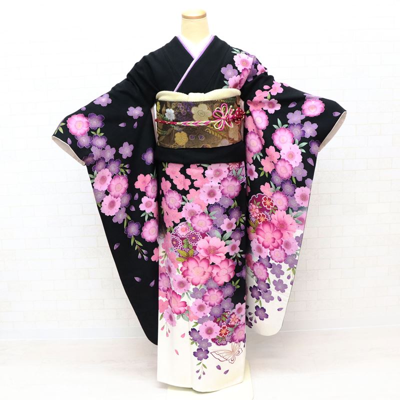 黒地のお着物に華やかなピンク紫の花々が豪華にデザインされています。