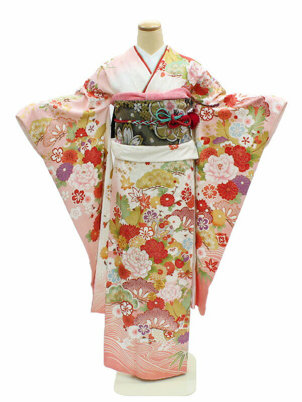 淡いピンクと白の地色に牡丹、笠松、菊などの古典柄が豪華に描かれた振袖です。