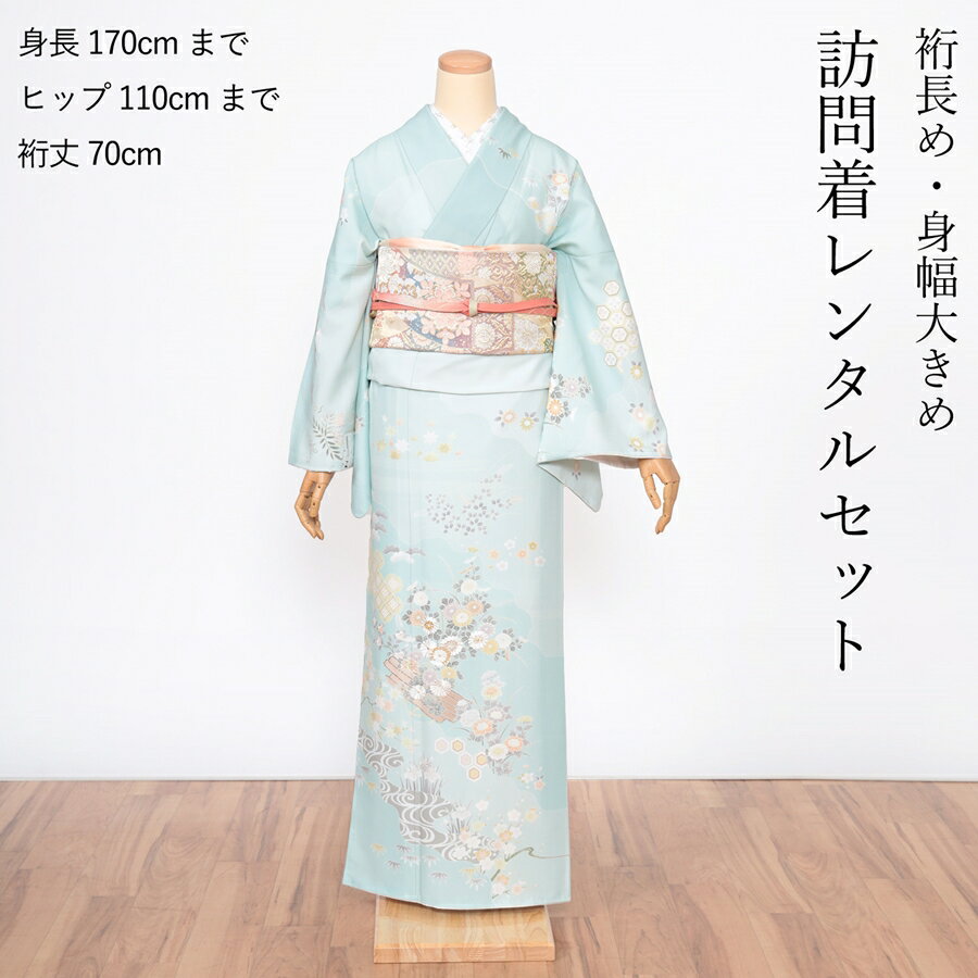 【対応サイズ】 身長 170cmまで ヒップ 110cmまで 洋服サイズ15号ぐらいまで 【年代】 30代・40代・50代・60代 【寸法】 身丈:肩から4尺5寸0分 裄 :1尺8寸5分 袖丈:1尺3寸0分 【素材】 ポリエステル 【レンタル期間】 3泊4日(翌日返却) <セット内容> 訪問着・長襦袢(二部式タイプ)・袋帯・帯揚げ・帯締め・草履・バッグ・腰紐・伊達締め・前板・コーリンベルト・帯枕・衿芯・着物スリップ・新品足袋 ご予約前に予約状況とレンタル規約をご確認ください。