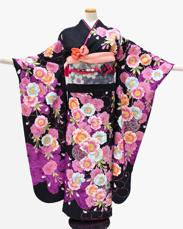 【10%OFFクーポン】 【レンタル】 振袖レンタル 成人式 振袖 1月 2027年 安い 着物 女性 和装 衣装 高級 正絹 呉服屋 黒 格安 フルセット 身長155-170cm 桜 手まり NR-85 全国配送 宅配レンタル 通販 レトロ モダン おしゃれ 可愛い