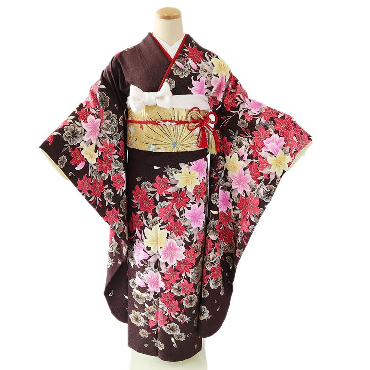 【SALEクーポン】 振袖 中古 フルセット 正絹 一式 茶 ダークブラウン 赤 百合の花 振り袖 ふりそで 晴れ着 結婚式 格安 リサイクル 仕立て上がり 帯 袋帯 帯締め 帯揚げ 重ね衿 着物 和服 和装 華やか 豪華 コーディネート済 送料無料