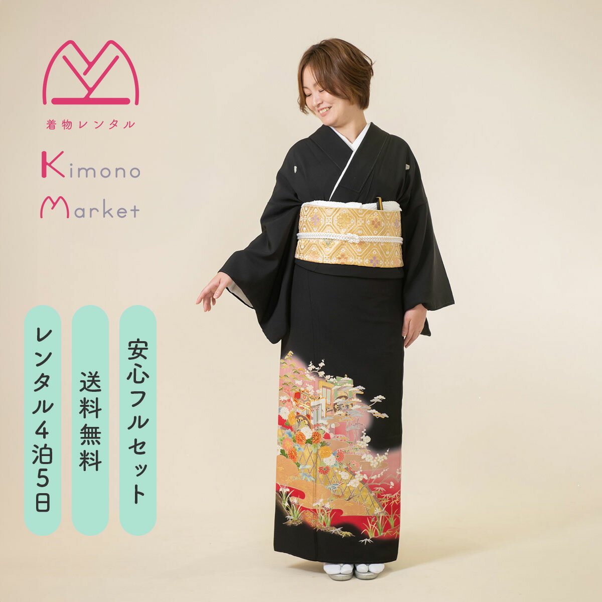 黒留袖 格安 レンタル 着物 フルセット 草履バックセット 結婚式 江戸褄 母親 留袖 着物レンタル 留袖レンタル 往復送料無料 帯 袷 御所車 菊 あやめ 雲取 伝統的 華やか ー花にしき(L)ー